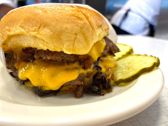 This terrific smash burger is cooked with a lot of fresh shaved onion…take a look: