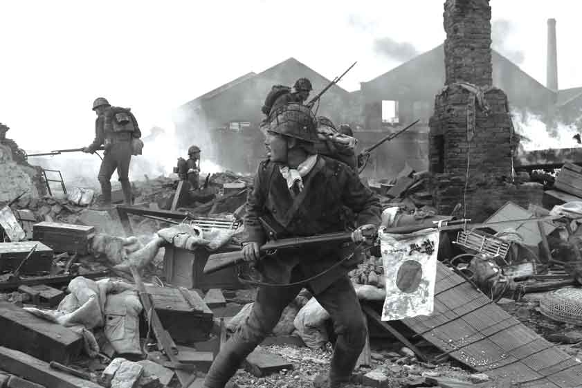 “Life and Death” is broken into two sections. The first shows the fall of Nanking. The Chinese army, cursed with horrible equipment and worse leaders, fights valiantly but is doomed. The Japanese move in and soon the Chinese trample each other in flight. These early scenes recall “Saving Private Ryan” in their gritty realism.