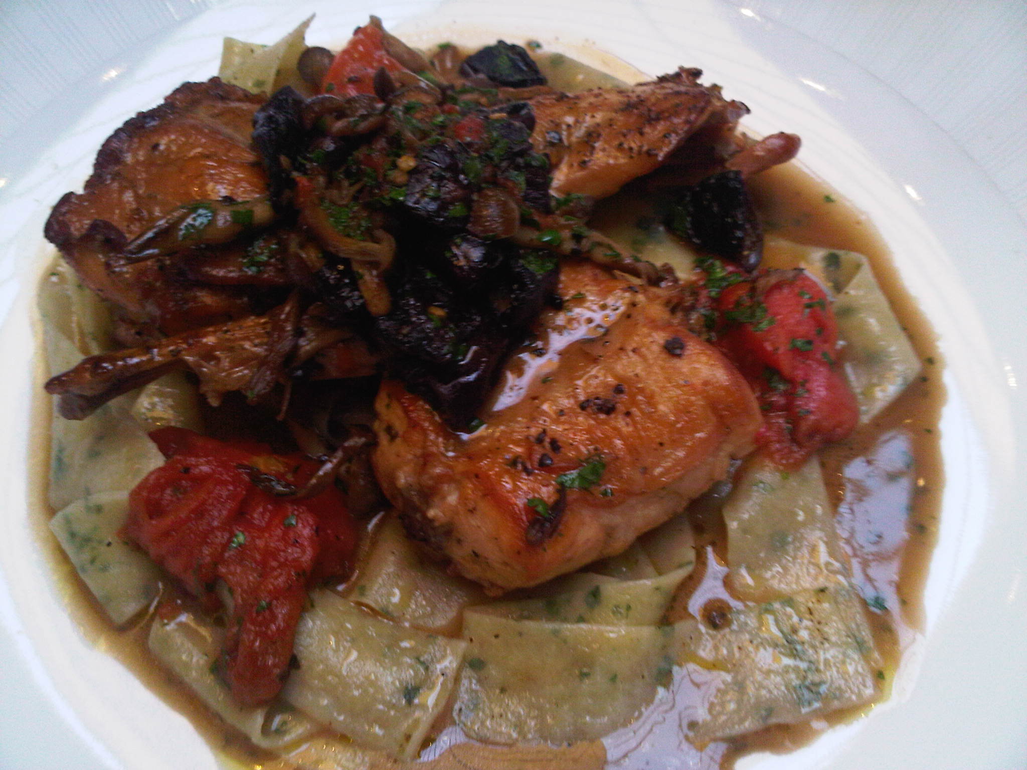 The kitchen. The place where magic is made. Dedicated Chefs work tireless to creative culinary masterpieces for you to eat. Delicious dishes like this one: A roasted chicken served over mushroom pappardelle – as served to me recently in Napa Valley…