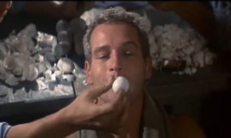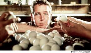 The egg scene is just one of many classic moments in this classic film…like when Luke wins a poker game on a bluff of a hand, and Dragline sees his cards…