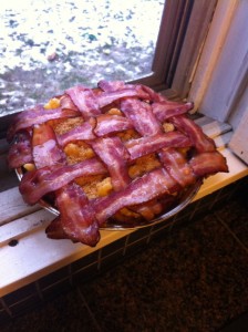 Here is how they describe it on their website: “To create the bacon crust I took a pound of Nueske’s Thick-Sliced Peppered Bacon and created a bacon weave on a sheet of tinfoil. I then flipped the bacon weave into a pie tin and patted it down before placing another pie tin on top of it so it would keep its shape when cooking. I also put together the lattice top (this time using Nueske’s Applewood Smoked Bacon) at the same time and put it in the oven along with the crust so that when the macaroni and cheese was done cooking on the stove I could fill the mostly cooked bacon crust with it, add some breadcrumbs, cover it with the lattice top and then throw it back in the oven to finish cooking. Once the pie was all done I let it cool on the window sill for a little while and then dug in!”