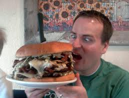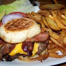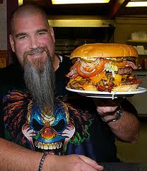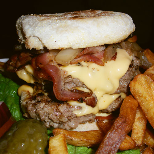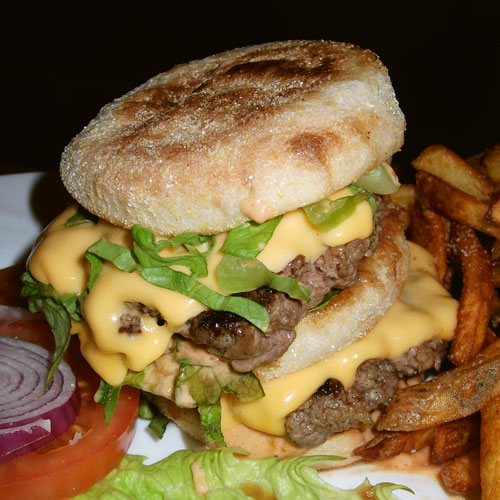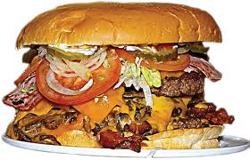 This HUGE burger was featured on “Man Vs. Food”. Here is what they cooked up for Adam Richman: 2 x 1 lb patties, bacon, mushrooms, Swiss cheese and blue cheese on each layer, plus mayo lettuce and tomato, and a basket of Big Jud’s fries…enjoy!