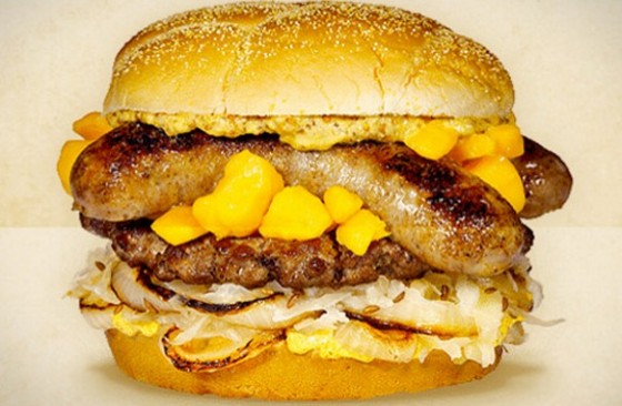Those crazy Wisconsin cheese makers are back with another entry from their terrific website….this time it’s a beef patty topped with Wisconsin cheese curds, a split bratwurst, sautéed onions, beer mustard, and sauerkraut on a Kaiser roll. Dig in!