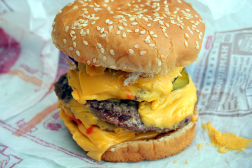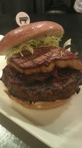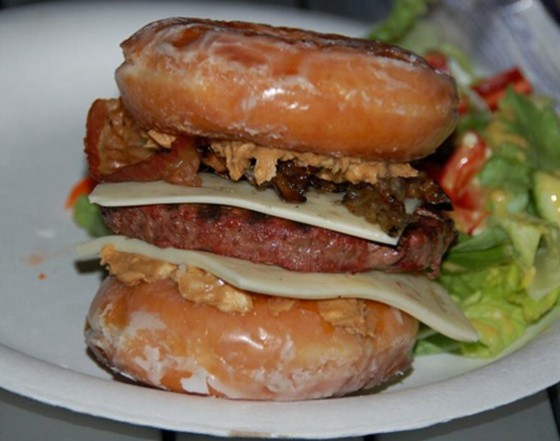 A one third pound of sirloin topped with two slices of white American cheese, four strips of bacon, peanut butter, between two Krispy Kreme donuts. Dig In!