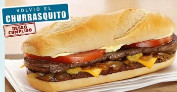 There are three varieties: Churrasquito Tradicional (with cheese, lettuce, tomato and mayo); Churrasquito Patagónico (with grilled onions); and Churrasquito Pampeano (with ham and cheese on the beef).