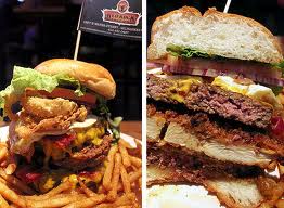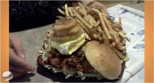 Not much to it – just a 1/2-lb burger topped with cheese and bacon, a deep fried chicken breast, and another 1/2-lb burger topped with cheese, bacon, an egg, lettuce, tomato and onion strings.