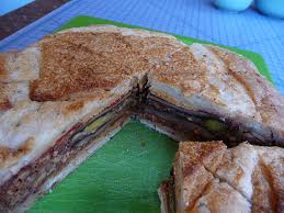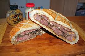 Basic directions: Hollow out a loaf of sourdough bread. Fill with steaks, mushroom, and onions. Cover, wrap in paper, and press the hell out of it overnight with a heavy weight. Slice into pie-like wedges for consumption the next day.