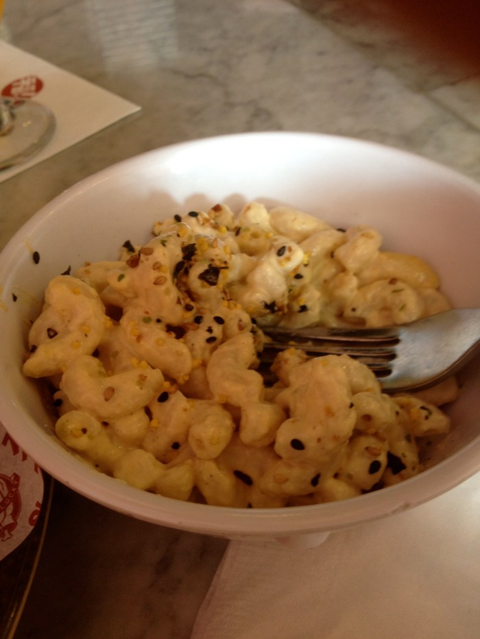 My FUKU burger was juicy and full of added flavor, and it holds together as you eat it, as you can see. They offer a number of side dishes, including terrific fries with their fuku sauce on top, but I went with a macaroni side dish – and get this, it’s only $2…