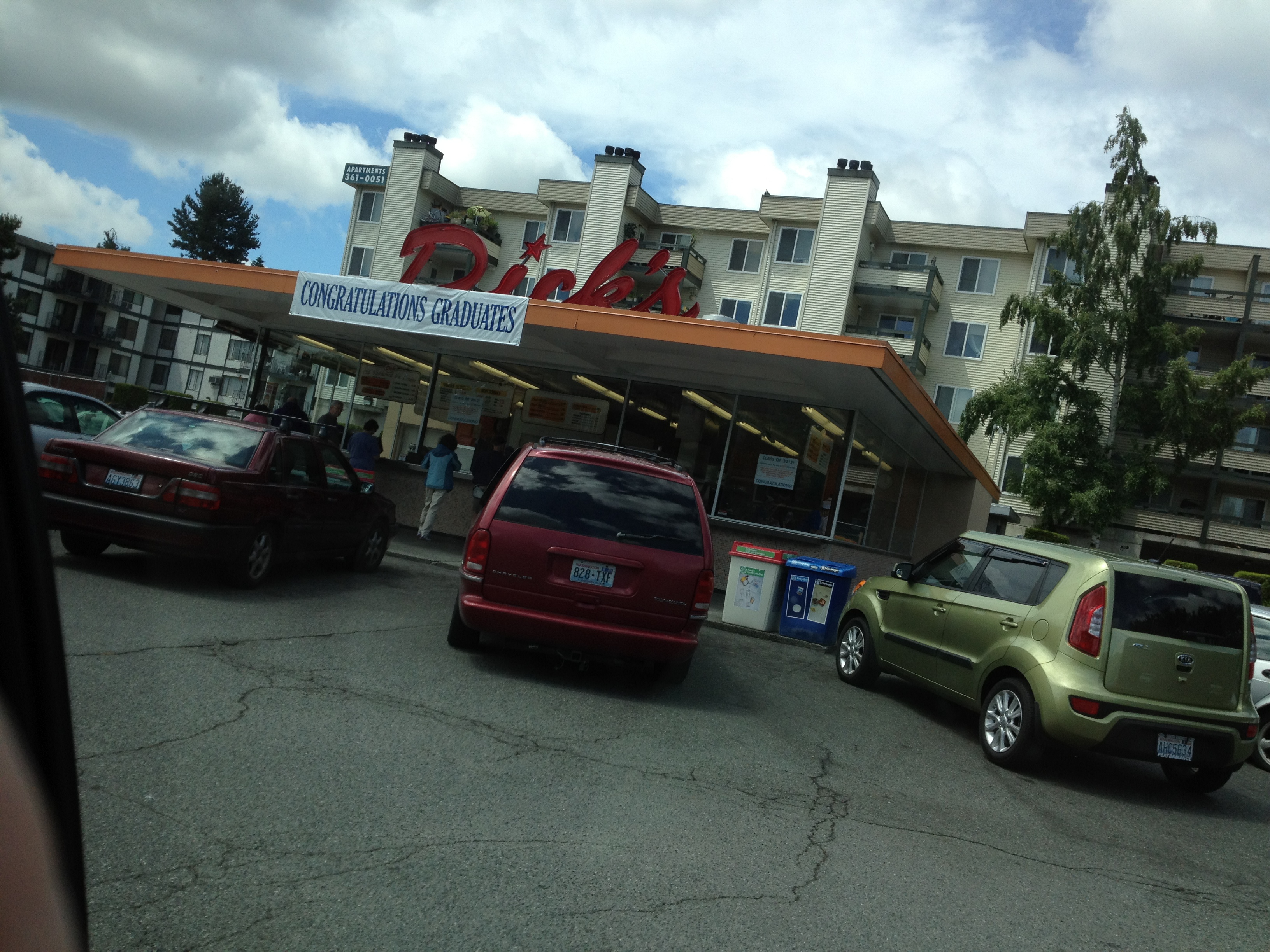 Here is the headline: “Seattle-area chain Dick’s Drive-In is celebrating the graduation season with a free cheeseburger or hamburger to any high school or college graduate who shows up at any Dick’s Drive-In in their cap and gown, until June 21.”