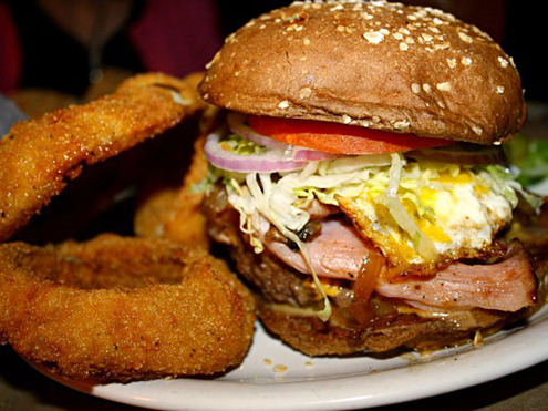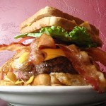 Here is a gut-buster to open up your arteries…a flame-broiled half pound burger made of premium ground sirloin is topped with 2 fried eggs, 4 American cheese slices, 5 strips of crispy fried bacon, and instead of a being placed in between buns it is placed between two grilled cheese sandwiches. This burger comes with a your choice of side, mayo and a dill pickle.