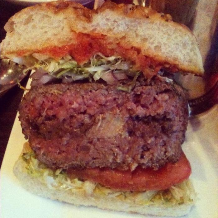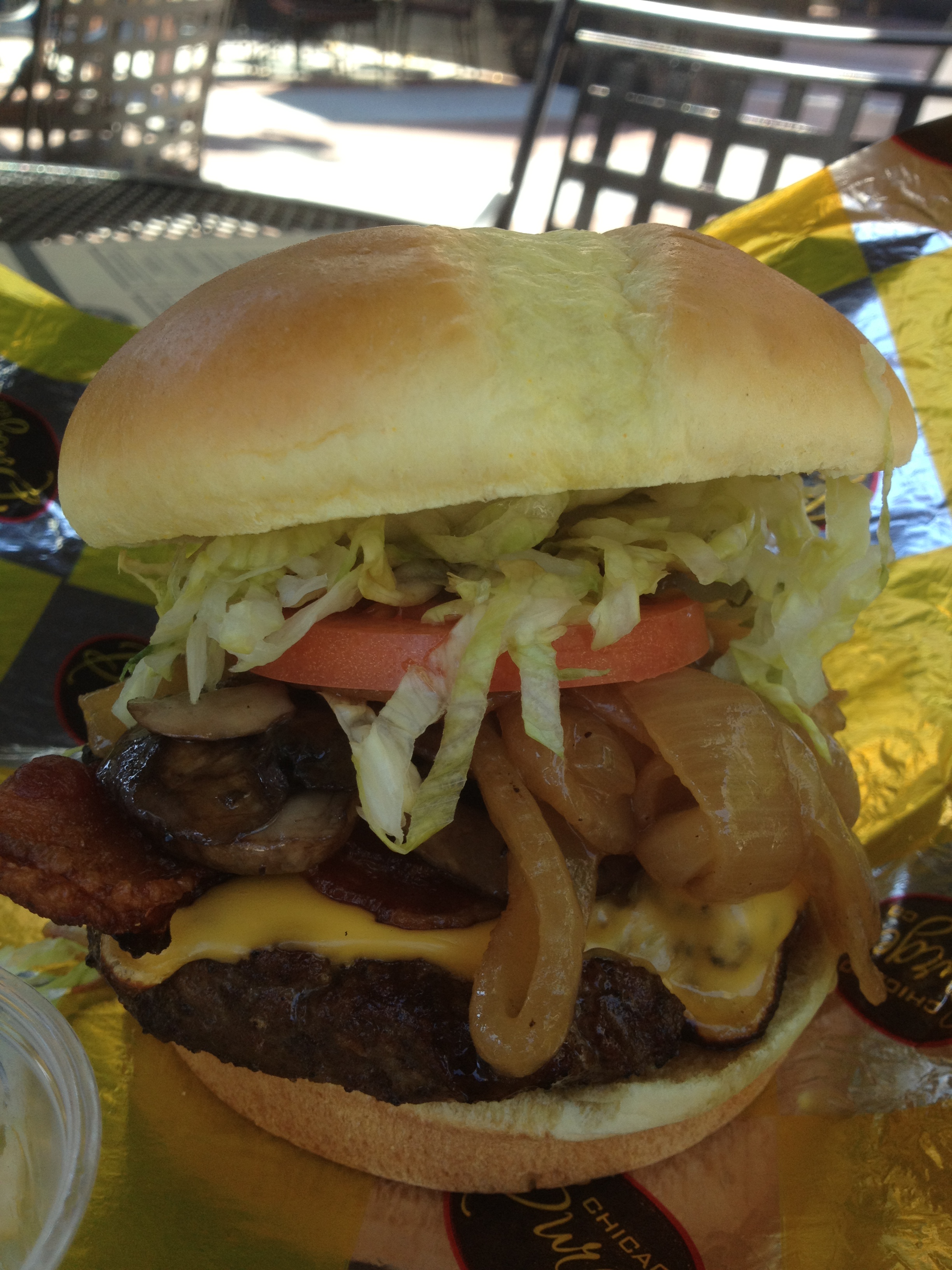 This burger stands up to a good CU photo: it is impressive when stacked up and showed off. It’s not an inexpensive burger: $13 with no side dishes…that said, it’s completely filling….