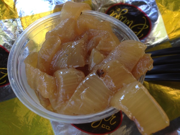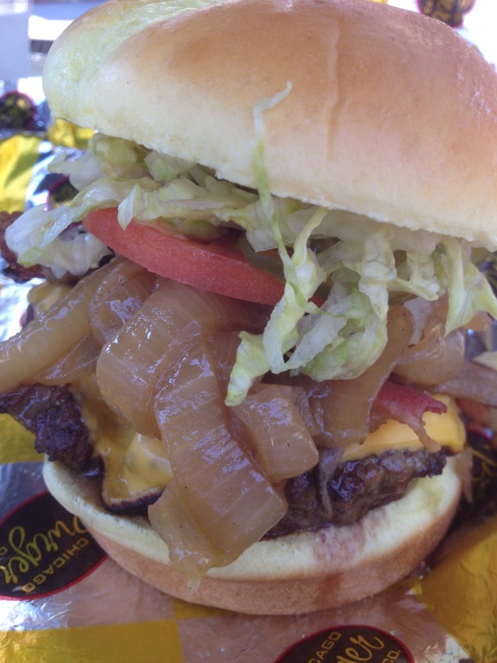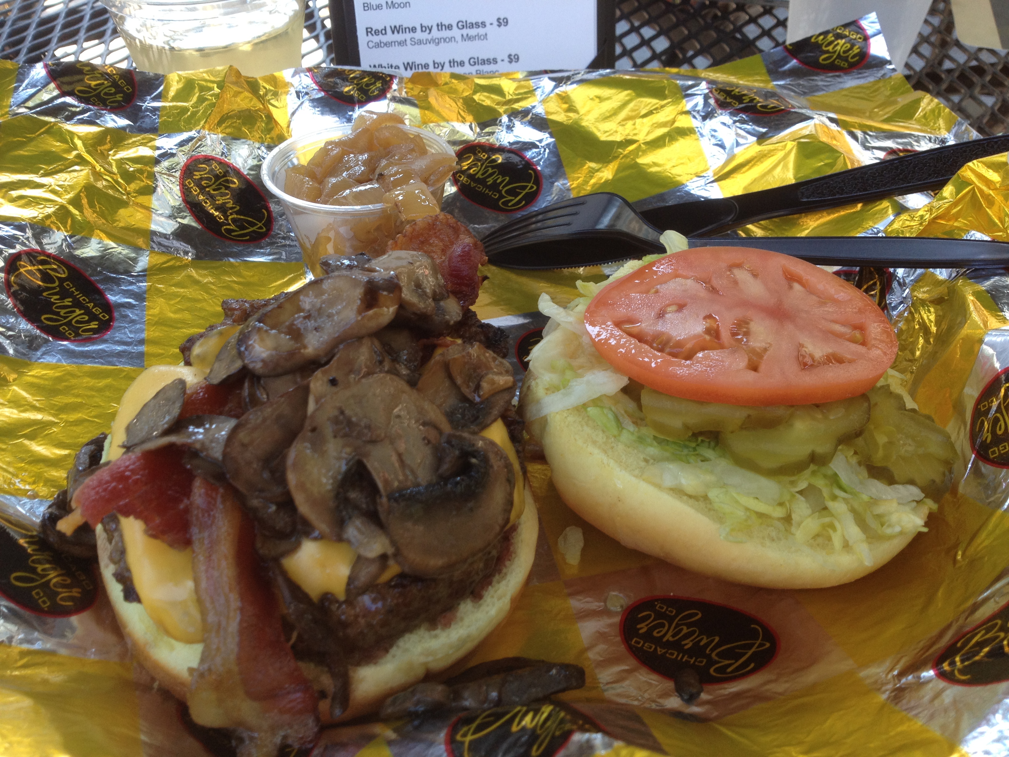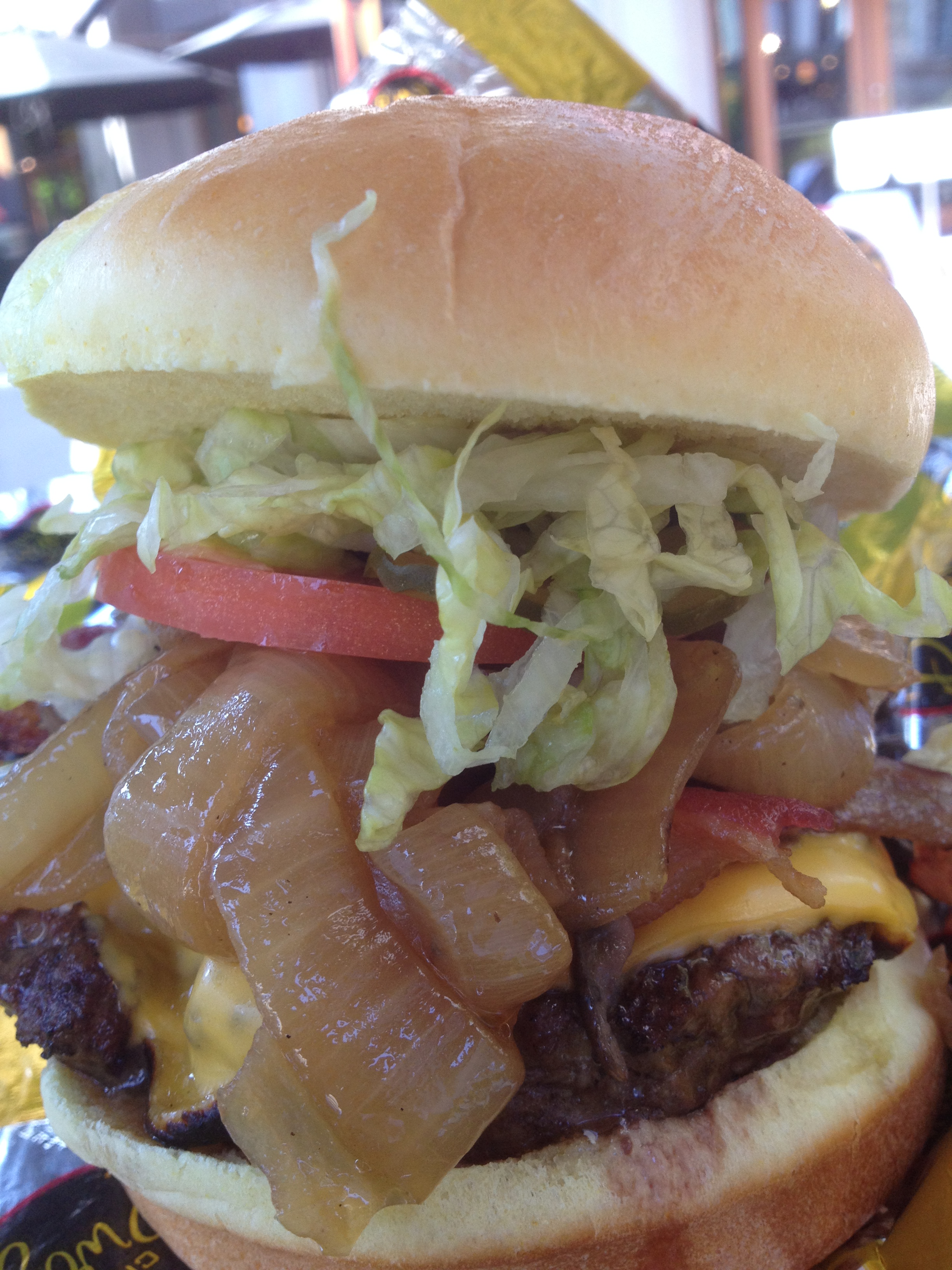 I didn’t order fries with it, as I wanted to stay focused on the burger in hand, which arrived looking like what you see above, all loaded up except for the carmelized onions, which arrive in a separate container: