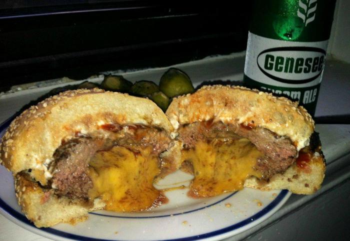 It’s a burger that has been stuffed with cheese – so much so that when you cut it in half…well, you see what happened, it spilled its guts!