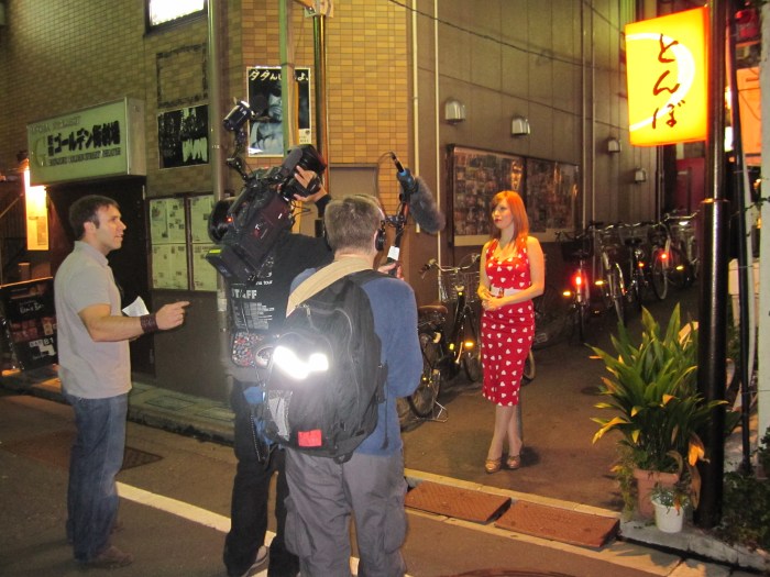 Golden Gai is a fascinating series of tiny alleyways, barely two people wide – with tiny little bars on both sides – one at street level and one located upstairs as well. We decided to capture the fun of this district – so our Tokyo Producer Nick arranged a visit – here is Alex doing a standup outside one of the entrances…