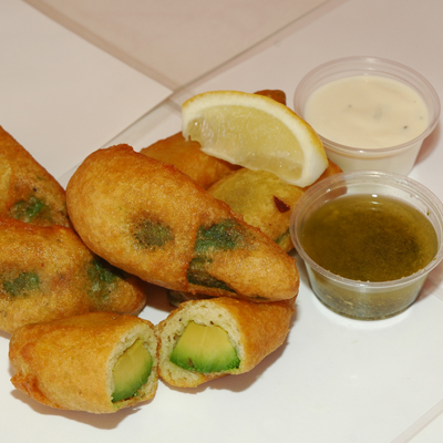 It wouldn’t be California if avocado didn’t get a starring role! This recipe consists of spears of tender avocado that have been coated in a corn-dog batter and fried until golden. These vitamin-rich nuggets come with a choice of two dipping sauces: ranch or herb-infused oil.