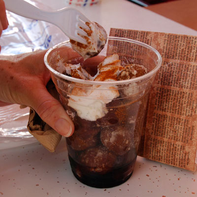 “Fried Coke” is Coca-Cola-flavored batter that’s deep-fried and garnished with Coca-Cola syrup, whipped cream, and cinnamon-sugar. Abel Gonzales Jr. won Most Creative for this concoction at the 2006 State Fair of Texas. Good job, Abel!