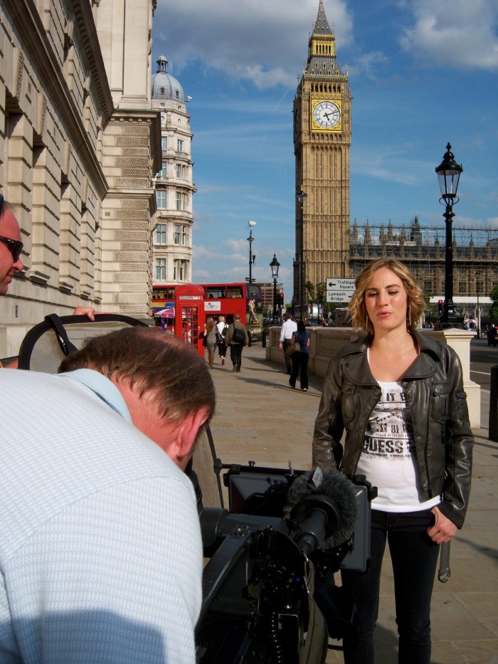 It was all part of a TV special being filmed in London, and we all had a terrific time, because it is an amazing city with great people, fun places to explore, and great backdrops for filming…here is a shot of Alison doing standups in front of Westminster Abbey: