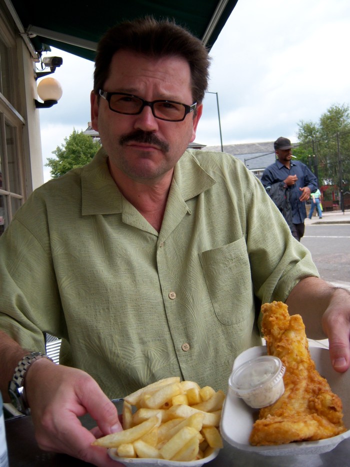 My son Jeff was with me, and I dragged him to my favorite fish ‘n’ chips shop in north London…The Sea Shell of Lisson Grove….as you can see he wasn’t that impressed…