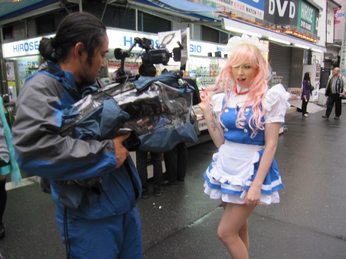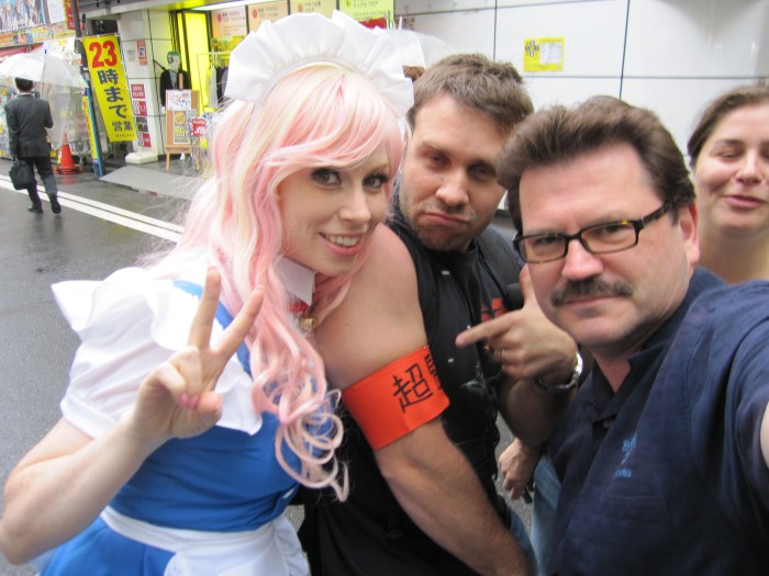 Of course, this intrigued us, and Alex was, of course, willing to don her Cosplay outfit to check out this unique area of Tokyo. We had Takeshi, our local cameraman with us – he is always terrific to work with…and it was the great team of Vinny Rutherford, Kristen Wheeler and Corrado Caretto – more shots of them to come…