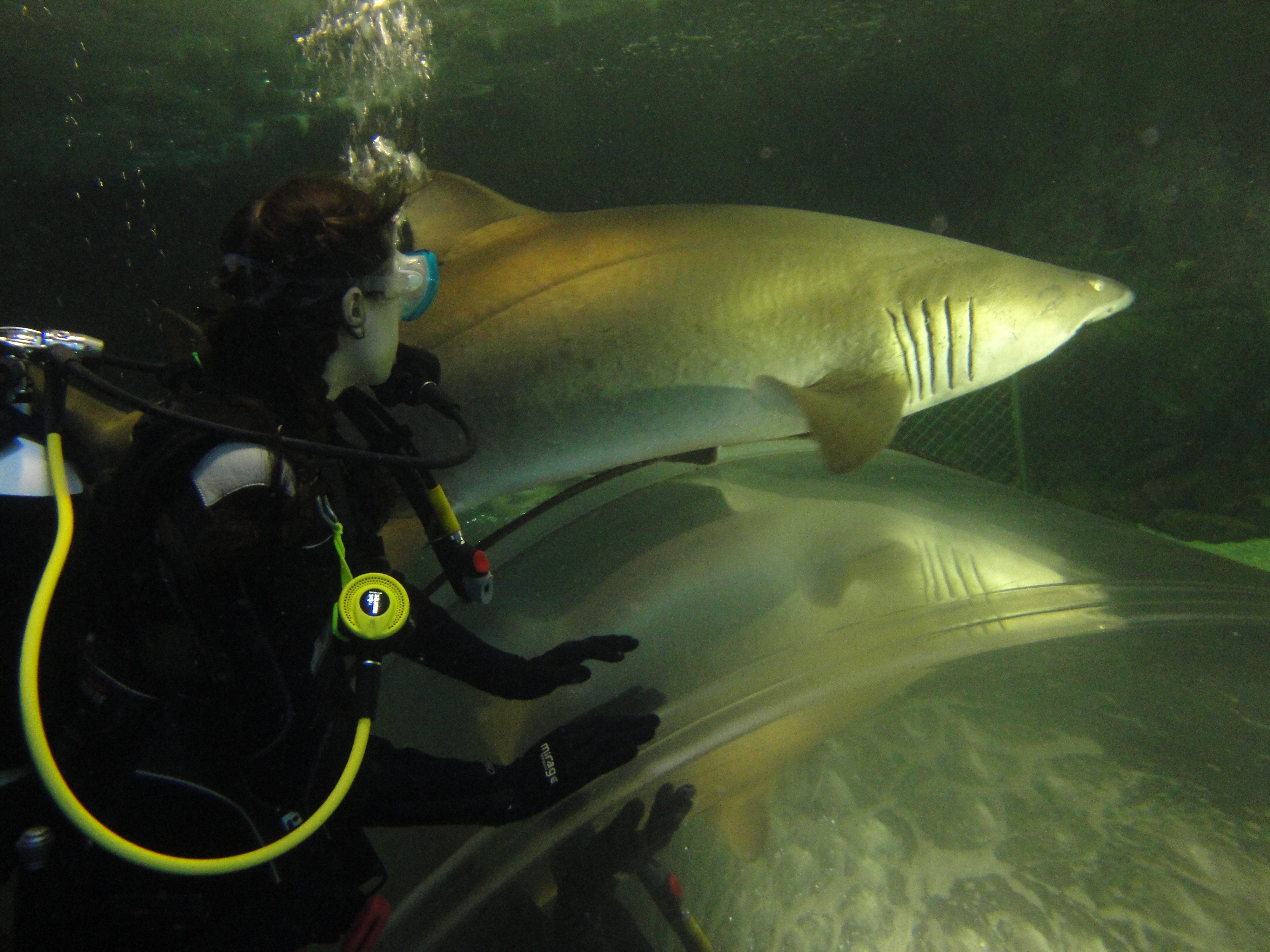 This next picture is really amazing: as Sasha is posing for me through the glass, TWO Sharks line up for a hilarious photo bomb! Or, as Sasha said later, “they were deciding which one was going to eat me first!”