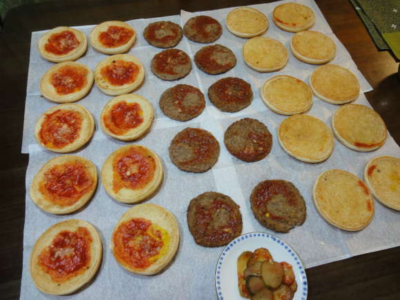 Here’s what we did. First, we separated the 10 hamburgers into 4 different parts – 2 separate piles of buns, the hamburger patties and the pickles. Then, we processed each part in a blender, and then we put all the components together to create a giant-sized hamburger. The most difficult part actually was blending the buns.