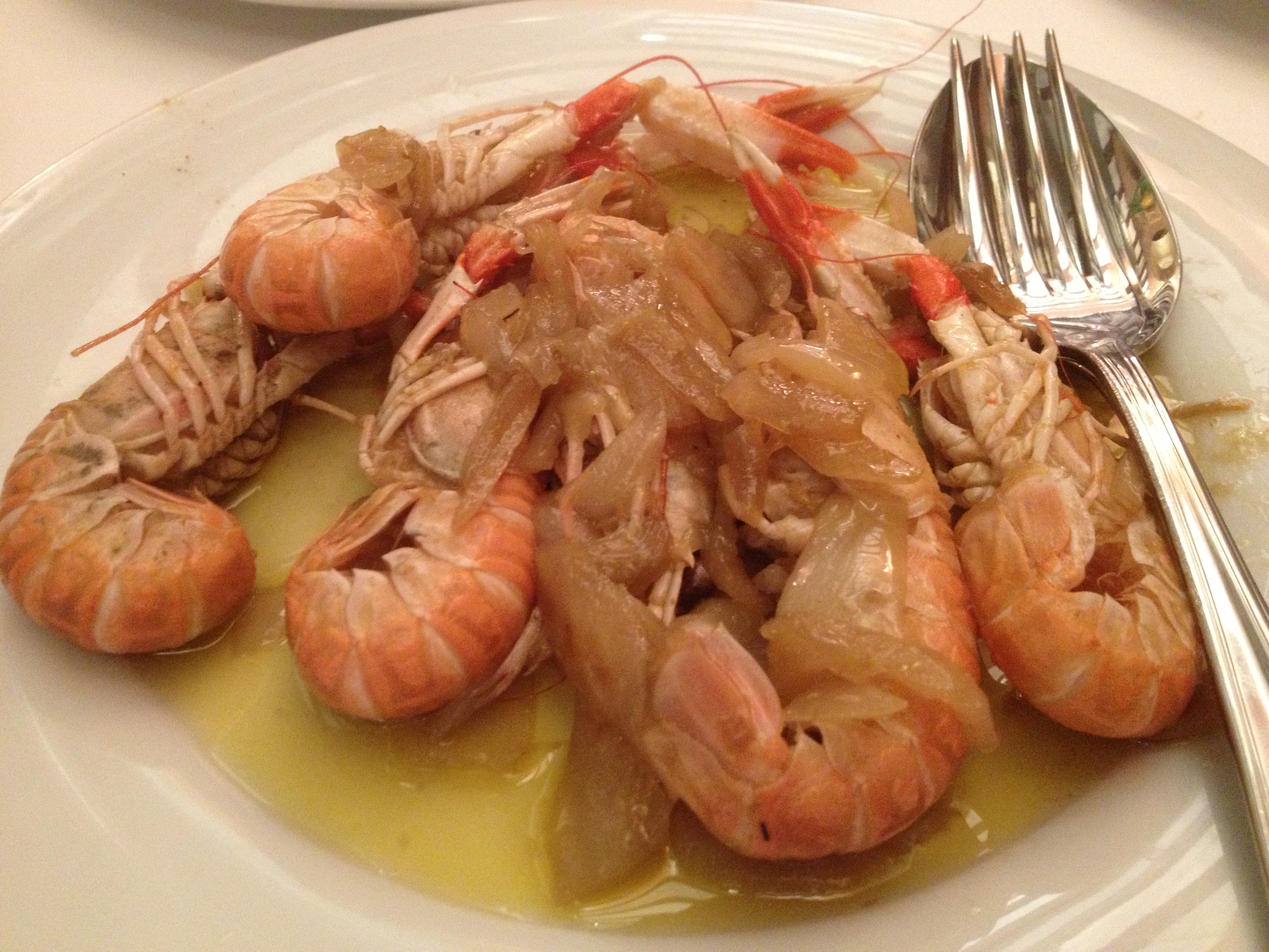 Alex is a huge fan of grilled shrimp, and we enjoyed these A LOT – the salt on the shell making your fingers a nice taste as well. Before we even finished our shrimp, another plate showed up, this one with grilled whole Langoustines – with sauteed onions!