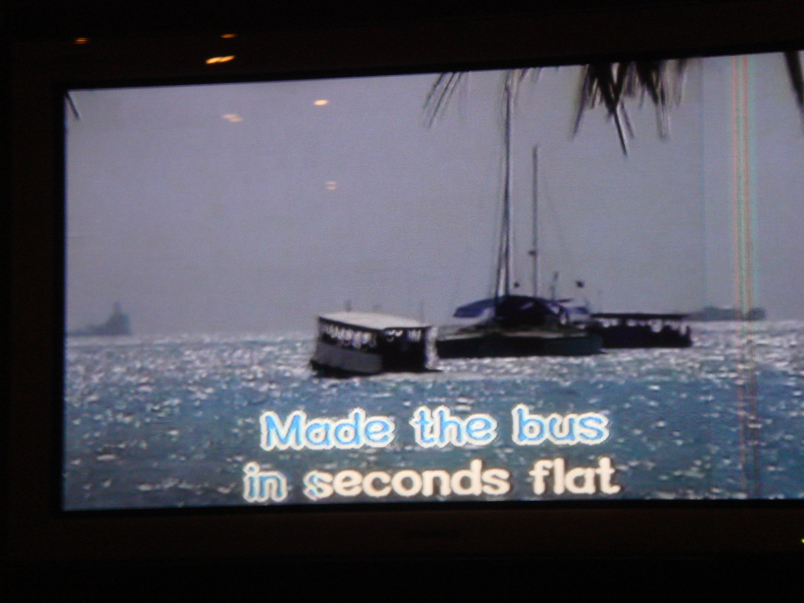 As you can see above, there are the lyrics for the song…and here is Aaron belting out what must be, according to the lyrics on the screen behind him, a TERRIFIC version of “Sweet Caroline.”