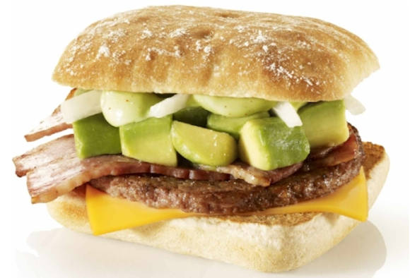 Here is how RocketNews24 describes it: “The Avocado Beef burger comes with sliced onion, chunks of avocado, a slice of cheddar cheese, and a dollop of wasabi sauce, all topped off with two rashers of bacon. The other two, as well as swapping their main ingredients for chicken or shrimp, respectively, are served with avocado and spicy cobb salad sauce, with the chicken sandwich also receiving a cheeky slice of cheddar.”