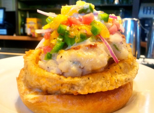 The Yacht Rock Shrimp Burger has a juicy, Key West-style shrimp & conch patty topped with a citrus-pico de gallo of diced peppers, tomatoes, onions and oranges. Then it is drizzled with a light coconut & pineapple cream. And served in a crispy, giant PYT onion ring.