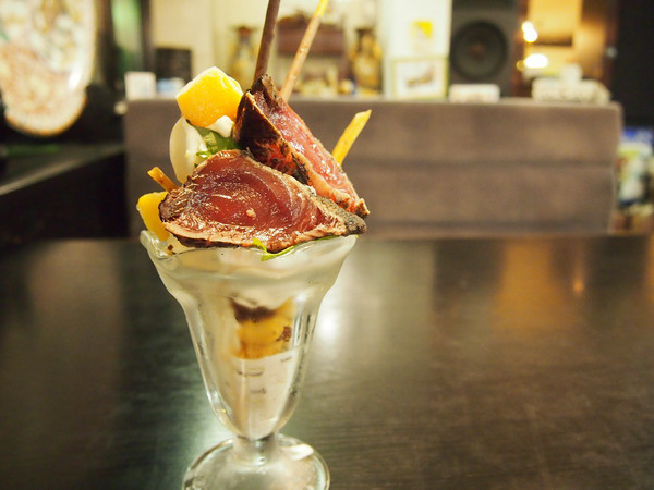 “a lightly grilled sashimi bonito parfait, which combines the rich, succulent flavours of seared fish and garlic with the sweet taste of ice cream!”