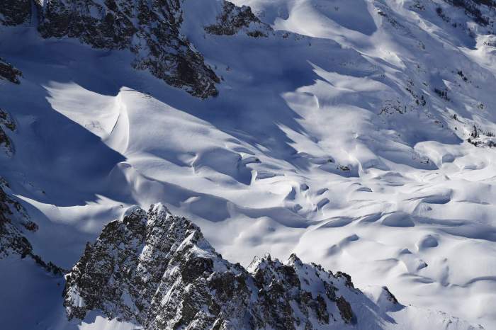 NYT/MAMOUTH LAKES, CA-3/2/2017– The Sierra Snowpack is much deeper than it has been in many many years. NASA has a plane that research scientists from the Jet Propulsion Lab use to record telemetry about the snowpack. We fly over the eastern Sierras in the Mammouth Lakes area where NASA has collected data. . .. . . . . . . . . . . . . . .. . . . . . . . .. . . .. . . . . . .. . . . . <<<<>>>>: Closer in view of huge snow drifts in the Eastern Sierras. CREDIT PHOTO–JIM WILSON/THE NEW YORK TIMES. 10203627A NYTCREDIT: Jim Wilson/The New York Times