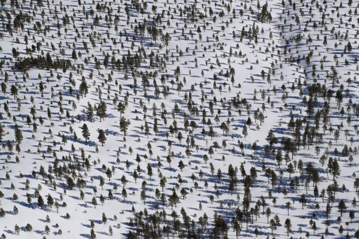NYT/MAMOUTH LAKES, CA-3/2/2017– The Sierra Snowpack is much deeper than it has been in many many years. NASA has a plane that research scientists from the Jet Propulsion Lab use to record telemetry about the snowpack. We fly over the eastern Sierras in the Mammouth Lakes area where NASA has collected data. . .. . . . . . . . . . . . . . .. . . . . . . . .. . . .. . . . . . .. . . . . <<<<>>>>: Trees on a slope in the snow covered eastern Sierras. CREDIT PHOTO–JIM WILSON/THE NEW YORK TIMES. 10203627A NYTCREDIT: Jim Wilson/The New York Times