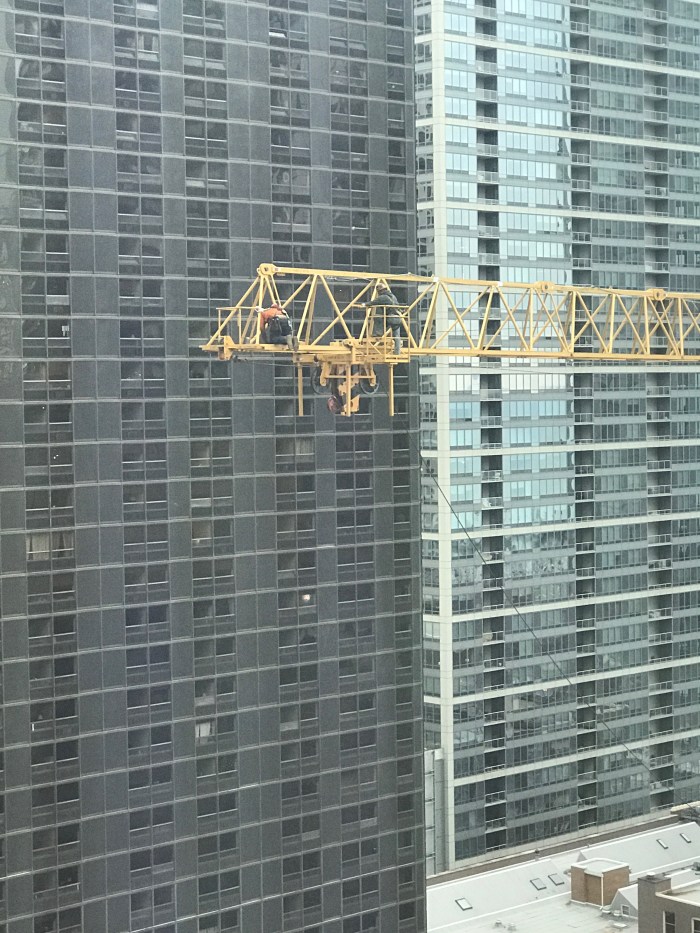This thunderstorm -with lots and lots of lightning, was amazing to experience, and I was equally fascinated by this skyscraper repair work high above Chicago’s Grand Ave.