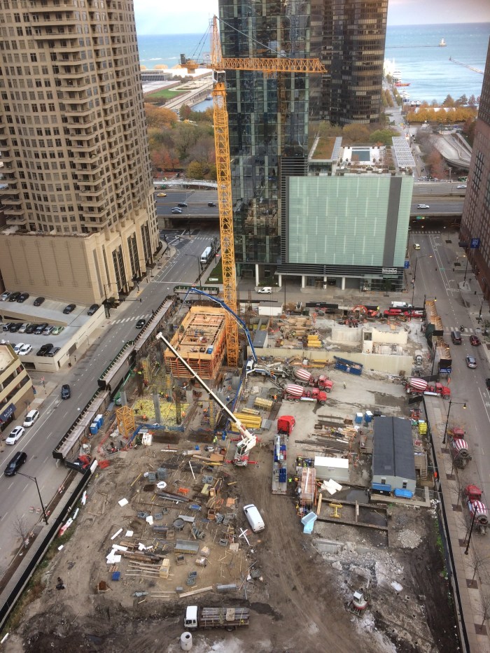 My wife and I live part of the year in Chicago – on the 25th floor of an apartment building that looks out at Lake Michigan and the Chicago River, and directly east of us was this empty lot, which in the beginning of November started becoming home to a new high rise building: