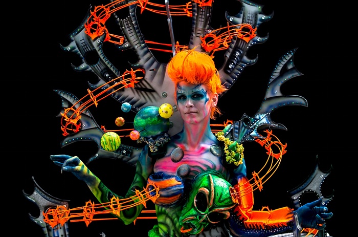 Kudos to “TheGuardian.com” for their coverage of this event. As The Guardian notes of the body painting above, “this majestic creation blends planets, alien figures and what looks like a rollercoaster track to turn the model into a galaxy not so far away.”