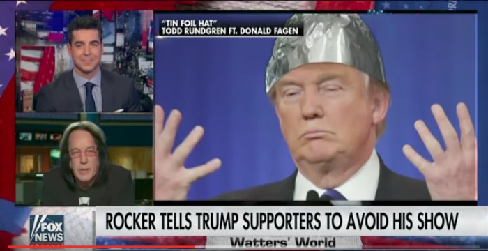 “Rundgren, who recently told Variety that Trump supporters should not come to his concerts, debuted “Tin Foil Hat” on Fox News’ “Watters World.” Rundgren told host Jesse Watters that he created the video to show at his live shows during a costume change, but it spurred shouting matches in the audience.
