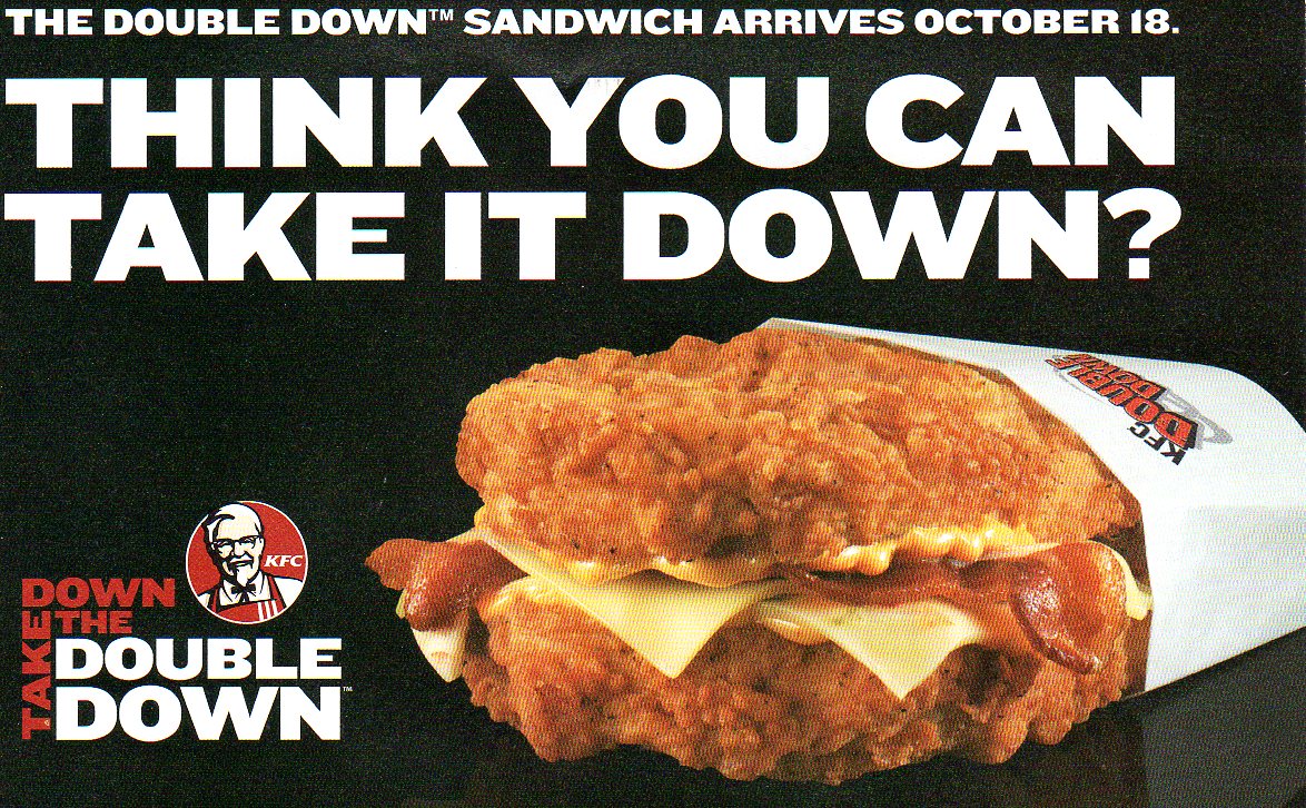 It doesn’t seem that long ago when KFC stunned the food world with their “double down” sandwich: bacon, cheese and creamy sauce stuffed between two pieces of boneless breaded fried chicken, acting as “buns”.