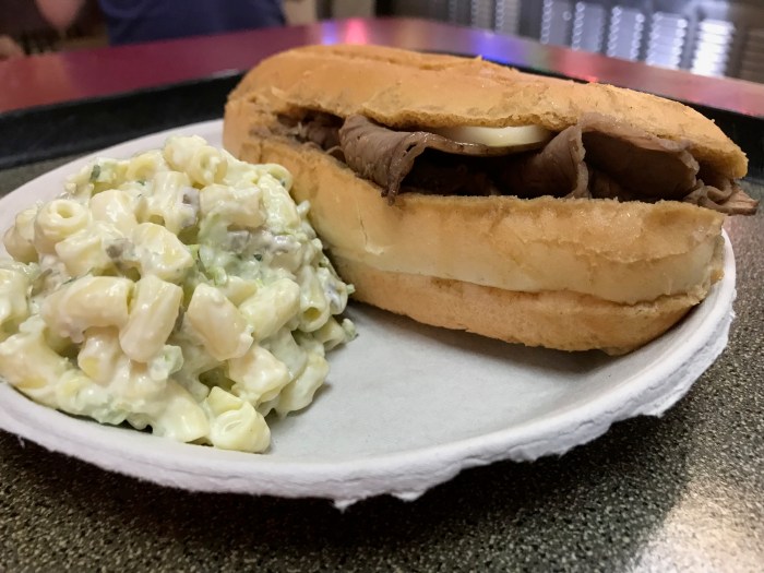 I just might go “wet” next time, because the au jus is delicious! I got a side of macaroni salad, literally a $1.70 – as you can see the sandwiches are very inexpensive as well – and very filling!