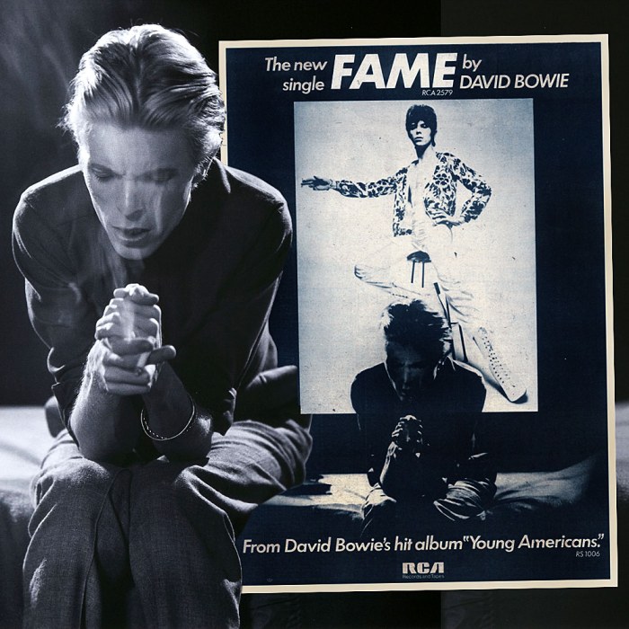 Bowie’s amazing 1975 song “Fame” was written by Bowie, Carlos Alomar and John Lennon, and was Bowie’s first number 1 single on the U.S. Billboard Hot 100.
