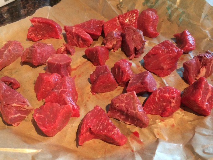 Dry the beef in paper towels; it will not brown if it is damp. Sauté it, a few pieces at a time, in the hot oil and bacon fat until nicely browned on all sides. Add it to the bacon.