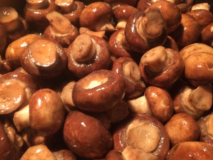 For the mushrooms, heat the butter and oil over high heat in a large skillet. As soon as the foam begins to subside add the mushrooms and toss and shake the pan for about five minutes. As soon as they have browned lightly, remove from heat. Set the mushrooms aside until needed.