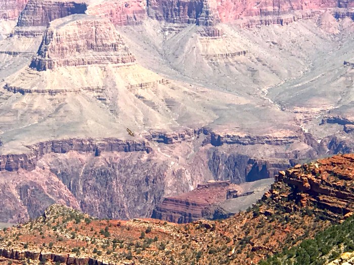 Note the bird flying just right of dead center in the picture: there are Eagles, hawks, and even condors up here – yes, condors!