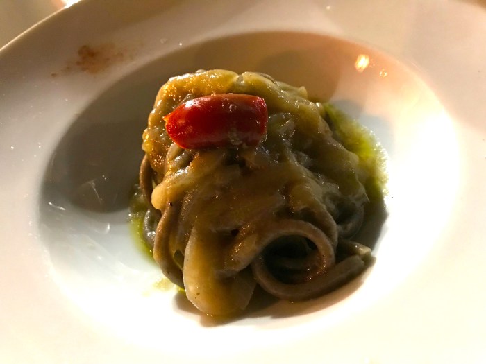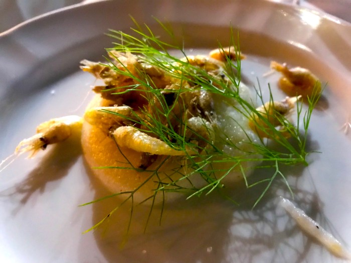 Sardines and Mantis Shrimp with Fennel was next – while Sardines are not well-prepared in the US very often, here they were fresh with a nice bit of “fishiness” – and up next was this very innovative dish: