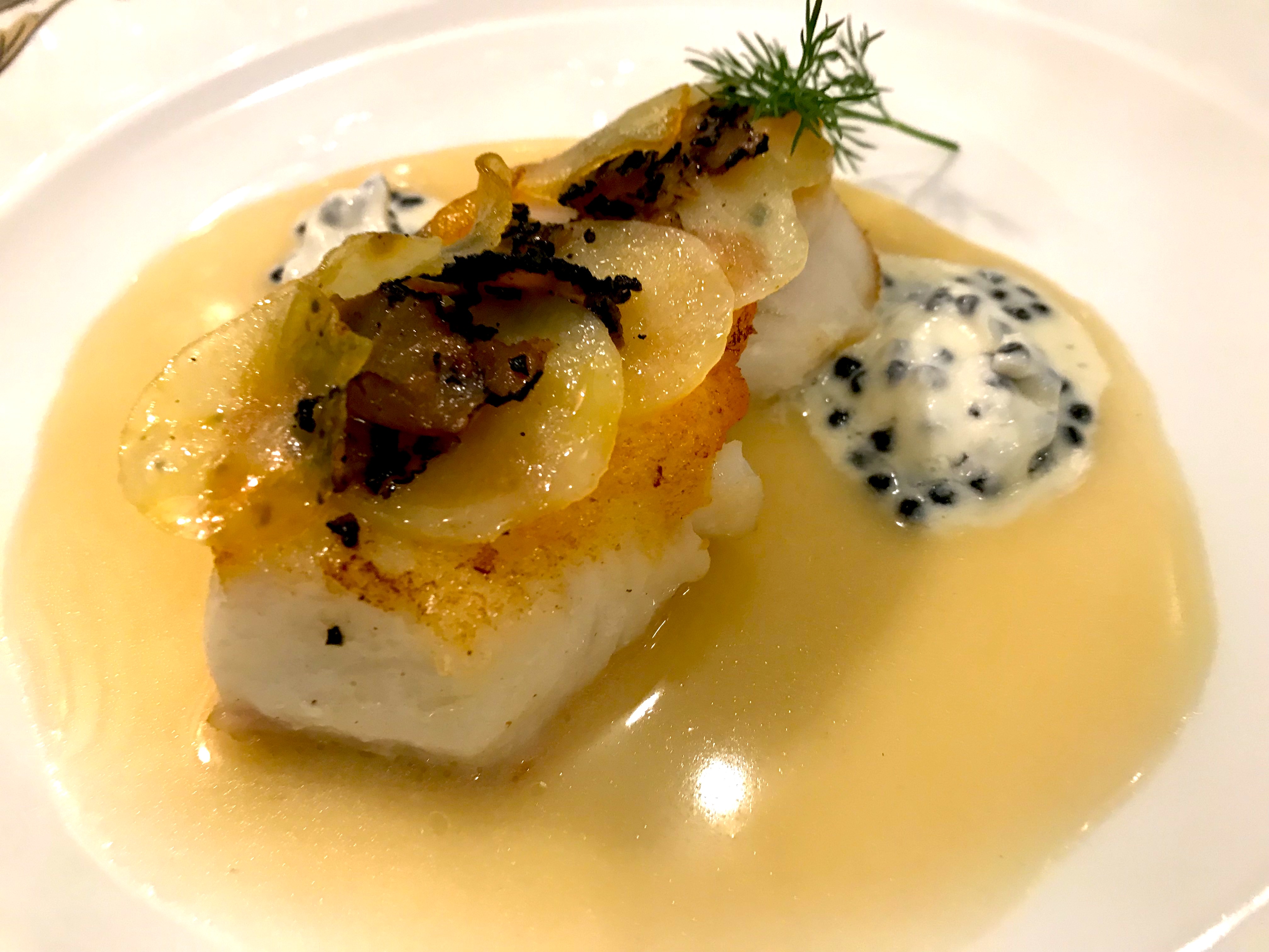 The dinner menu is a four course affair, although as you can see from the above menu, you can order ala carte as well, but we loved what they proposed, which began with a panfried turbot steak with thinly sliced potato scales and truffle carpaccio Champagne sauce: