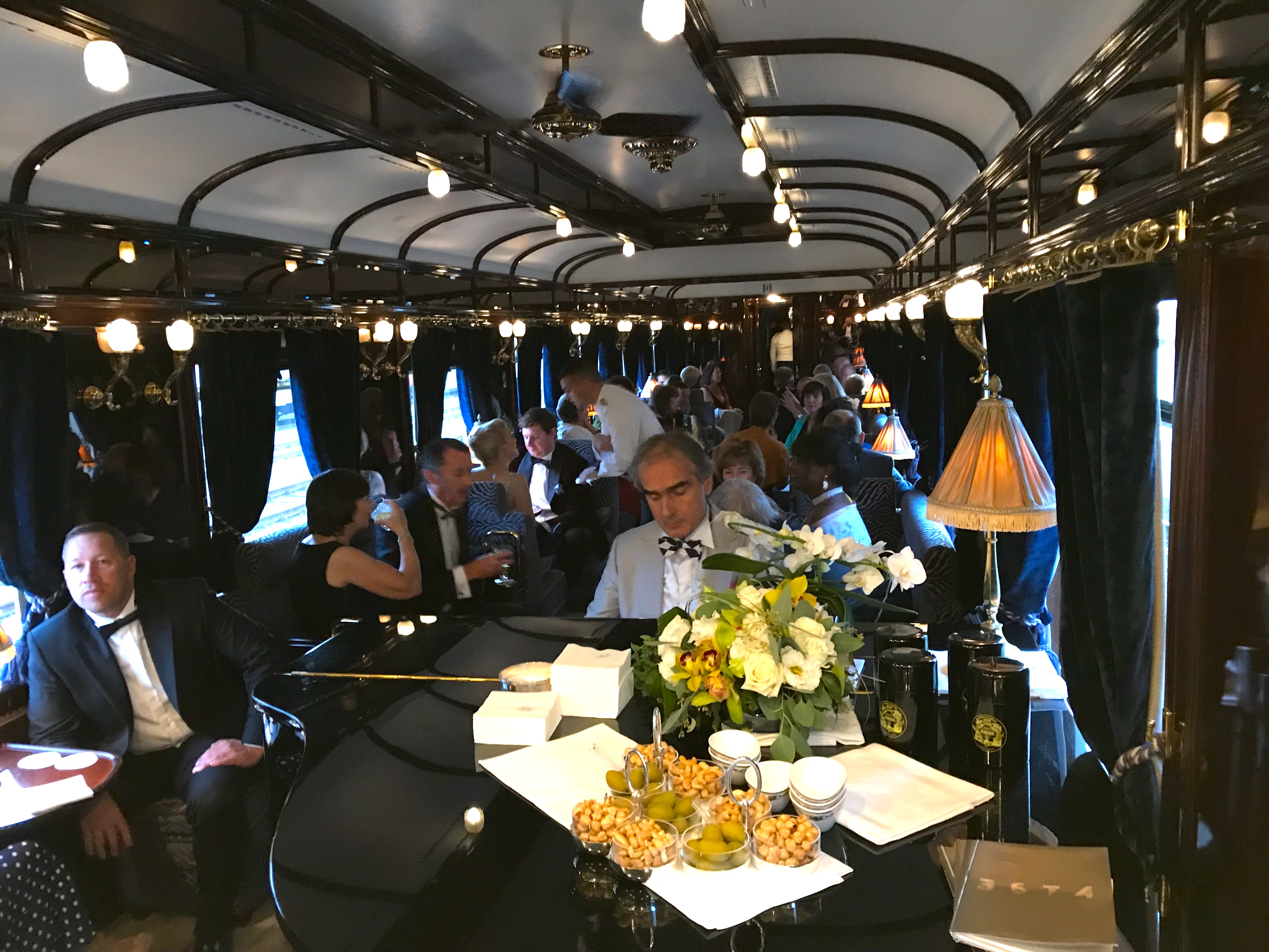 Of course, to get to dinner you must go through the bar car, and that means we begin our night with a special drink and some piano music…