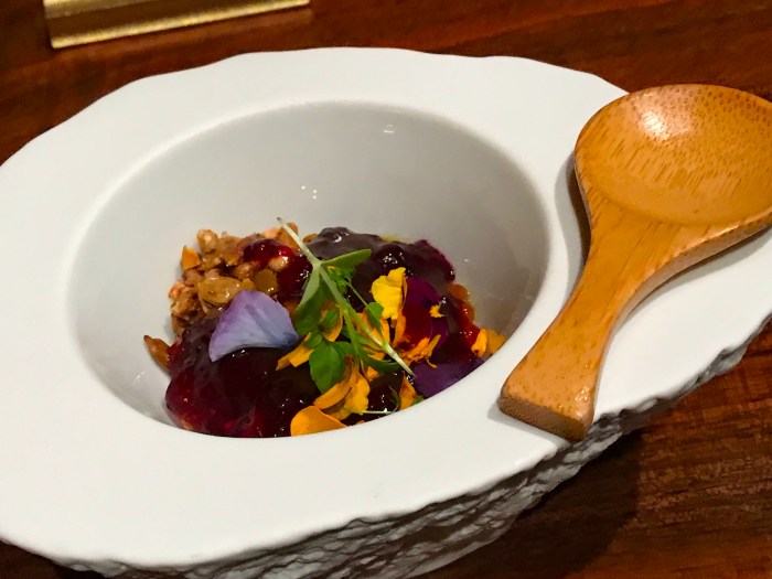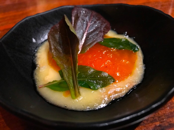 This next dish was so creative – seeds crushed at your table, then served in a bowl with trout roe, rendered duck fat oil and marigold flower extract!