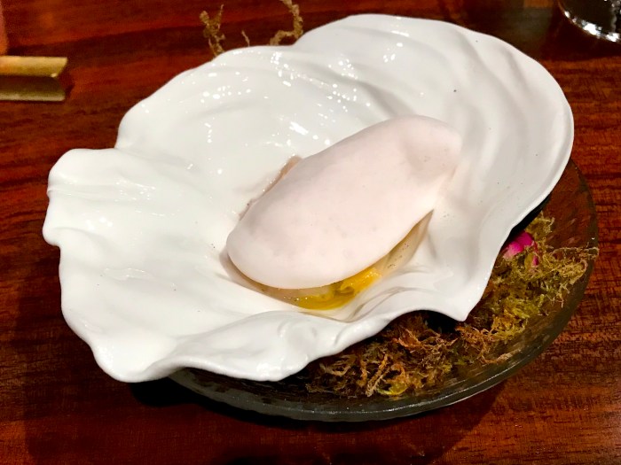 A Geoduck is a giant clam that I knew well from growing up in Seattle…it’s a tough chew normally, but his has been delicately sliced and poached on top of sea urchin and topped with some citrus foam….a delicious and briny bite…more from the sea is next: