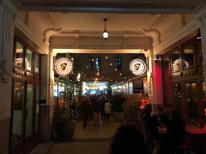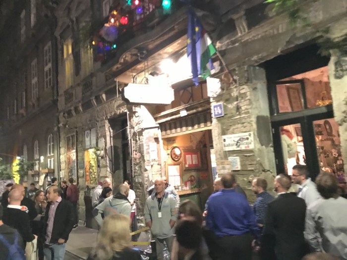 I didn’t get the pulled pork and lemonade sandwich that night, but we did try Hungarian red wine, which was delicious, as well as several local beers – and then we decided to find the most famous “ruin bar” of all: Szimpla Kert!