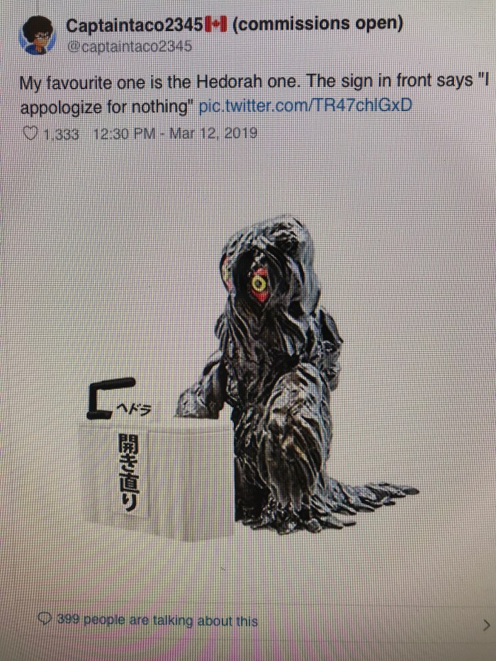 That’s right, you can see this tweet that points out that Hedorah refused to apologize for anything!