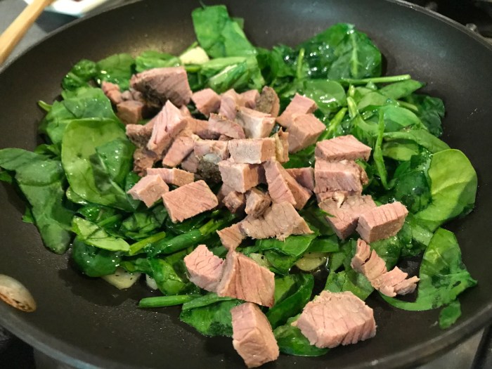 After I added the spinach, I threw in the leftover meat – I kept it in nice sized chunks rather than dice it too fine – but that’s a personal preference…I could also have shaved it as well.